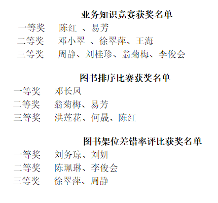 经过激烈地角逐,共有近20位同志脱颖而出,获得不同奖项。比赛中馆员们个个是能手,人人是高手,各楼层主任是传手,特别是以部门主任程水英为代表的业务能手团队传帮带手把手地指导新进员工学习。比赛充分调动了馆员们的工作积极性,形成了“人人争先、事事争优”的良好氛围,同时以此为契机更好地树立“以读者为中心,服务育人”的工作理念,创新服务模式,为读者服务。