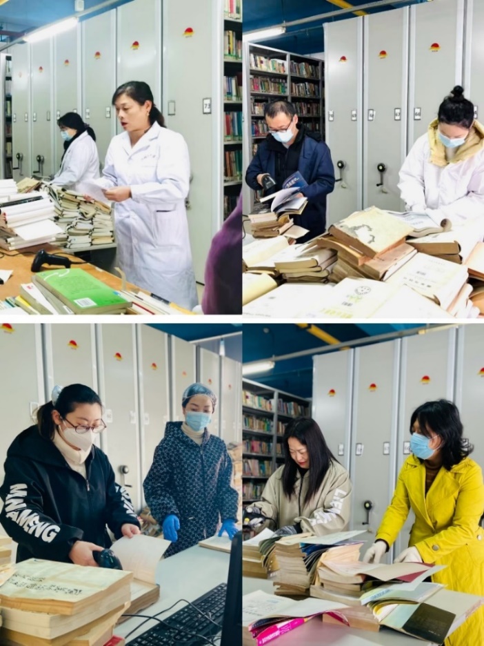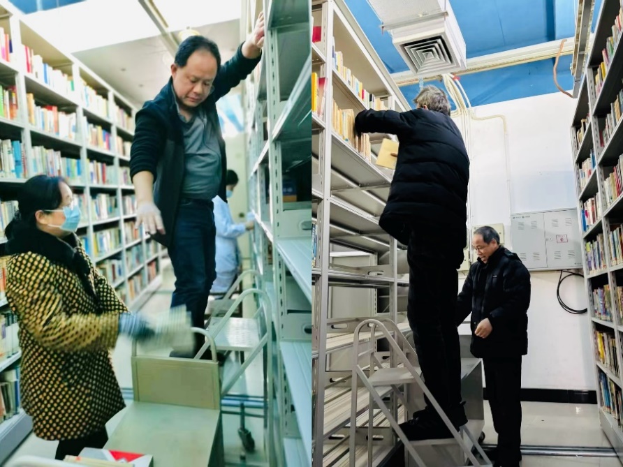 密集书库的日光灯管蒙着经年的灰,在狭窄过道显得格外昏暗,书库最深处,王海老师正一手扶着铁质爬梯的横杆,一手托着厚厚的图书塞进书架,衬衫后背早已浸出一片深色汗渍。“这是最后一车了吧。”他抹了把额头的汗珠,一把接过翁菊梅老师递过来的近十本图书,这些年代久远的书籍,每本都裹挟着陈年纸张特有的潮湿霉味和厚厚的灰尘。王海老师用力抓握图书的手臂青筋暴起,汗珠顺着脸颊滚进衣领,铁梯在脚下发出细碎的吱呀声,不禁让人多出几分担心。